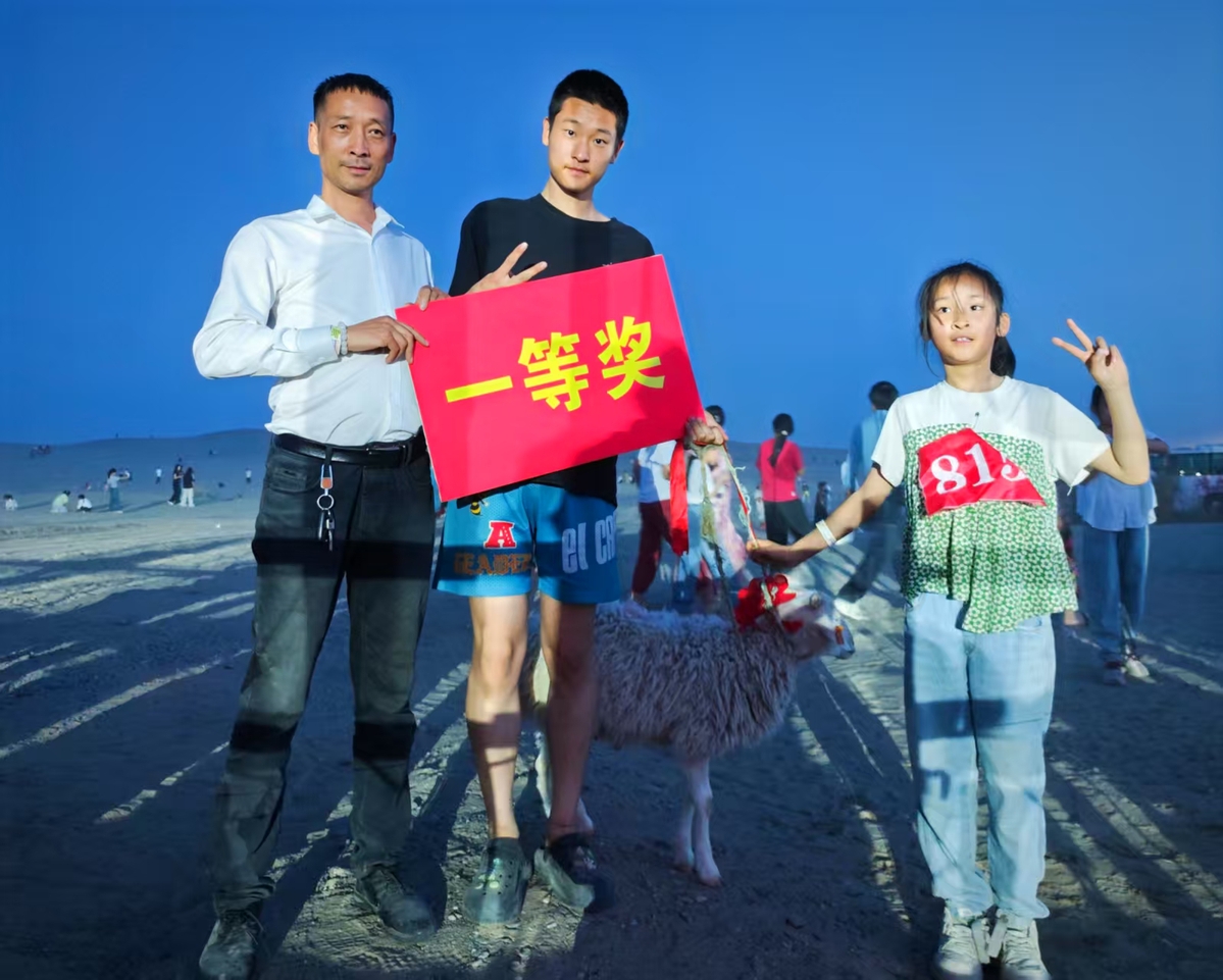這是5月1日洛浦縣玉龍灣沙漠樂(lè)園“大手拉小手”親子徒步比賽家庭組一等獎(jiǎng)獲得者哥哥李一銘與妹妹李鈺瑩在領(lǐng)取獎(jiǎng)品一只羊后與父親的合照。