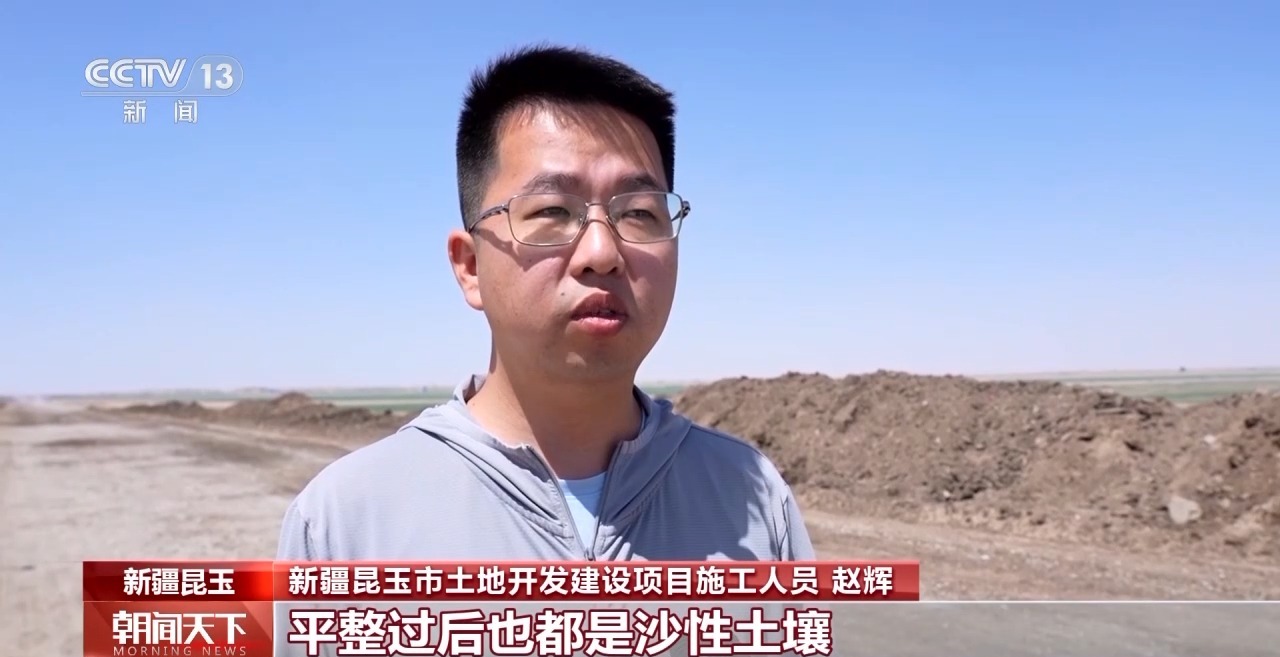 新疆昆玉市土地開發(fā)建設(shè)項目施工員 趙輝:這邊原本都是沙漠原始地貌,平整過后也都是沙性土壤,沙土的營養(yǎng)貧瘠,肥力差,抓一把土,能從指縫里漏掉90%。通過羊糞和水溶肥的有效結(jié)合,施進(jìn)去之后,我們能把沙土的結(jié)構(gòu)團(tuán)粒化,簡單來說就是把一團(tuán)散沙變成緊密有孔隙的小團(tuán)體,這樣施進(jìn)去的水和營養(yǎng)都能留存住。