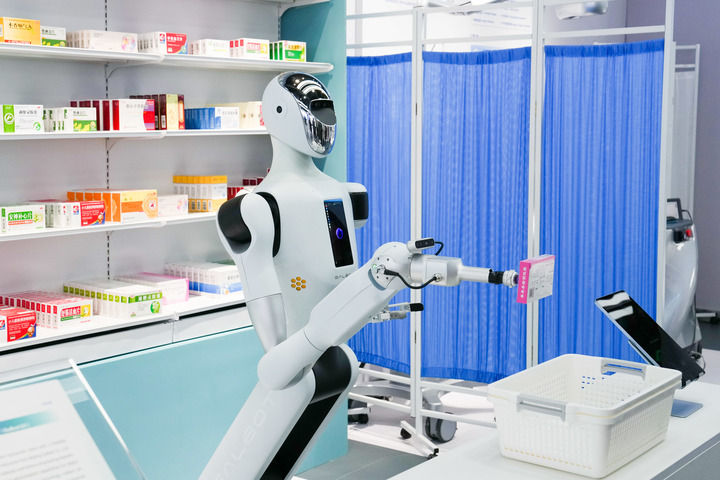 2025年2月24日,在北京“機(jī)器人大世界”的應(yīng)用場(chǎng)景示范區(qū),銀河通用機(jī)器人進(jìn)行藥店無(wú)人值守場(chǎng)景演示。