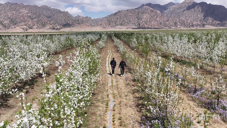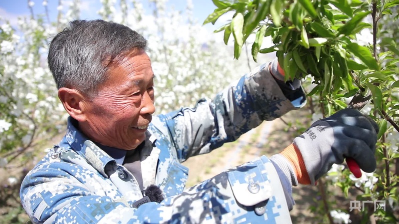 步入內(nèi)蒙古巴彥淖爾市烏拉特前旗白彥花鎮(zhèn)塔漢其嘎查林果產(chǎn)業(yè)園,大片果樹迎來最美花期,微風(fēng)拂過,花香沁人心脾,果園里村民高忠標(biāo)正專注地修剪著果樹?!拔医衲?0多歲了,在這里打工五六年了,一個月能掙五六千塊錢,挺好的?!?/p>