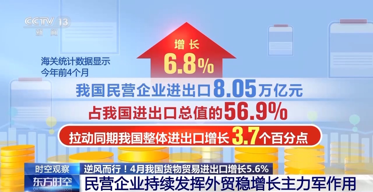 面對(duì)復(fù)雜外部環(huán)境,民營(yíng)企業(yè)識(shí)變應(yīng)變、主動(dòng)求變,在闖關(guān)突圍中打開增長(zhǎng)新空間,展現(xiàn)出強(qiáng)大韌性與創(chuàng)新能力。海關(guān)統(tǒng)計(jì)數(shù)據(jù)顯示,今年前4個(gè)月,我國(guó)民營(yíng)企業(yè)進(jìn)出口8.05萬(wàn)億元,增長(zhǎng)6.8%,占我國(guó)進(jìn)出口總值的56.9%,拉動(dòng)同期我國(guó)整體進(jìn)出口增長(zhǎng)3.7個(gè)百分點(diǎn)。其中,對(duì)東盟、拉丁美洲、非洲進(jìn)出口分別增長(zhǎng)9.6%、7%、14.4%。