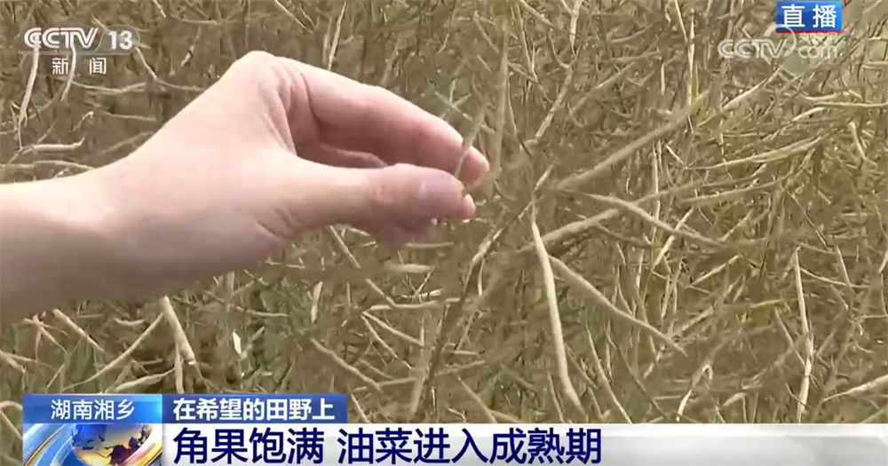 記者來到了湘潭湘鄉(xiāng)市泉塘鎮(zhèn)雙江村,油菜現(xiàn)在長得怎么樣了?油菜的頂端已經(jīng)呈金黃色,角果很飽滿,我們平時(shí)常說的油菜籽就藏在金黃色的角果里,這說明現(xiàn)在油菜已經(jīng)進(jìn)入成熟期了。