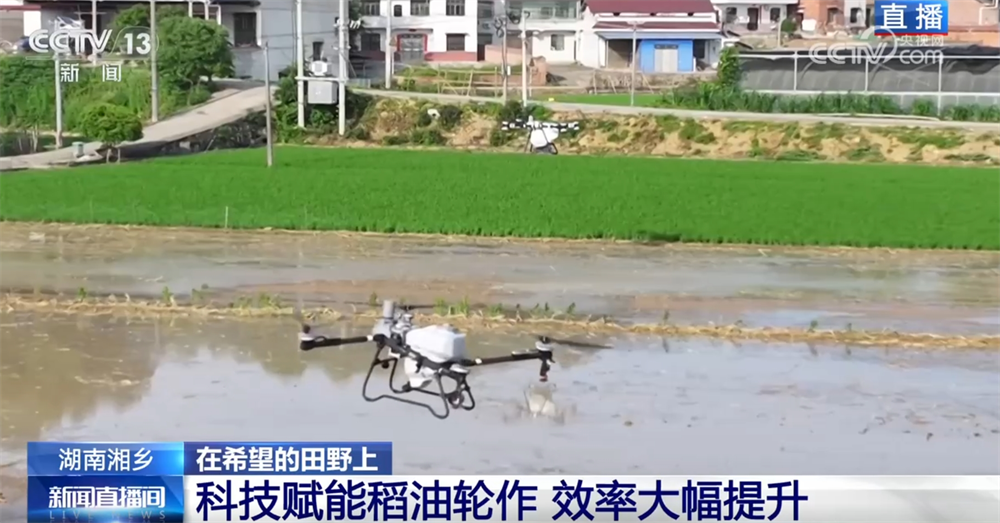 在這個(gè)階段,還有一件非常重要的工作就是施肥。眼下,施肥已經(jīng)很少依靠人工了。現(xiàn)場,大型的農(nóng)業(yè)無人機(jī)正在作業(yè),肥料均勻?yàn)⒃谔锢?。無人機(jī)還能做到自動避障、自動調(diào)節(jié)噴灑量,配備光譜儀還可以檢測莊稼的長勢,作業(yè)1畝地只需要不到20秒。