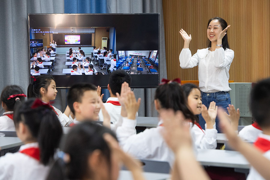 2022年5月16日,在湖北省荊州市沙市大賽巷小學(xué),學(xué)生通過“空中課堂”與偏遠(yuǎn)鄉(xiāng)鎮(zhèn)的丫角小學(xué)一起進(jìn)行韻律操活動(dòng)。 新華社記者 肖藝九 攝