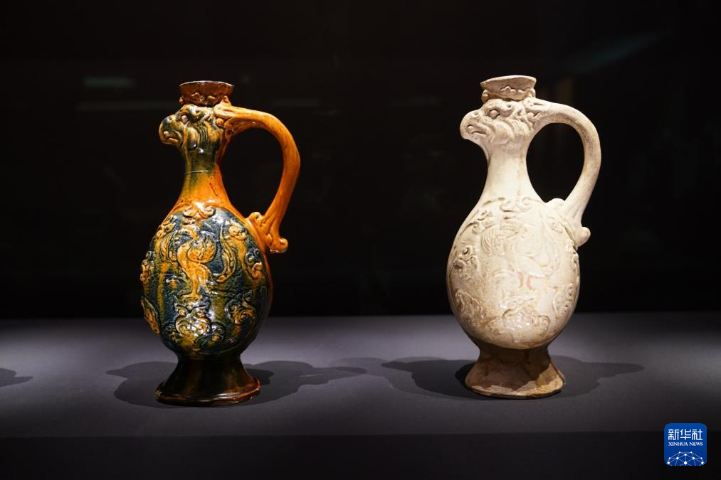 這是在展覽現(xiàn)場拍攝的故宮博物院藏唐代凸花鳳首壺(右)與舊金山亞洲藝術博物館藏鳳首壺(5月14日攝)。新華社 王申 攝