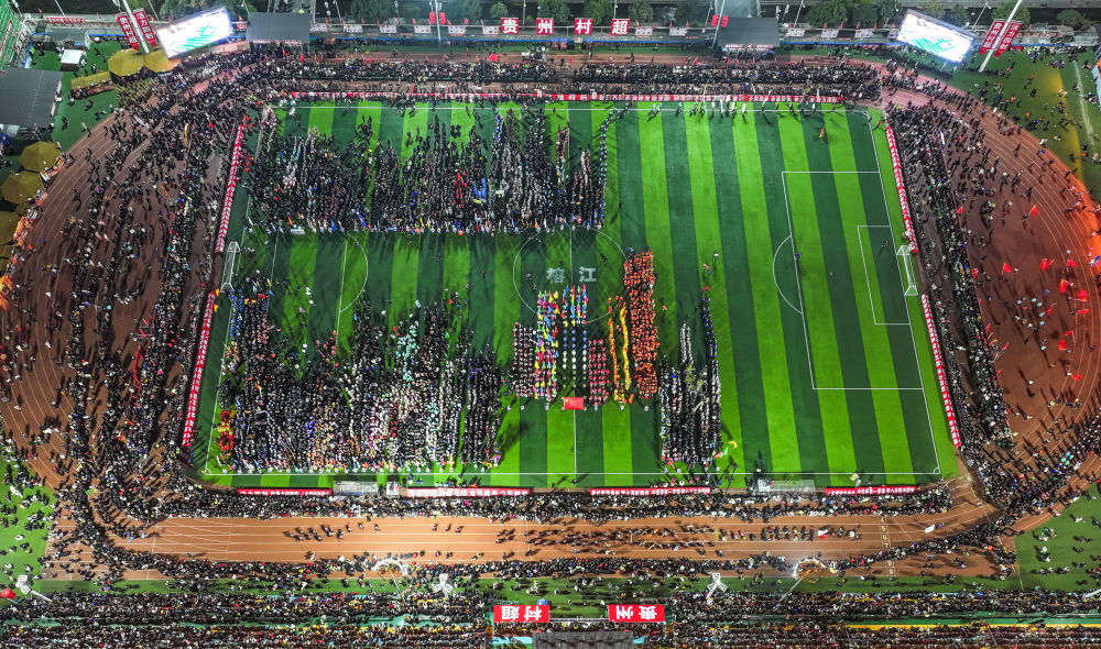 2025年貴州“村超”開幕式現(xiàn)場(chǎng)(2025年1月4日攝,無(wú)人機(jī)照片)。新華社記者 楊文斌 攝