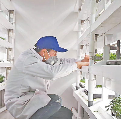 庫車市甬庫同心村智慧農(nóng)業(yè)植物工廠育苗室內(nèi),工作人員在仔細觀察幼苗。 王紅麗攝