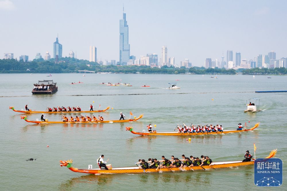 5月24日,龍舟隊伍在南京玄武湖上競逐(無人機(jī)照片)。新華社發(fā)(蘇陽攝)