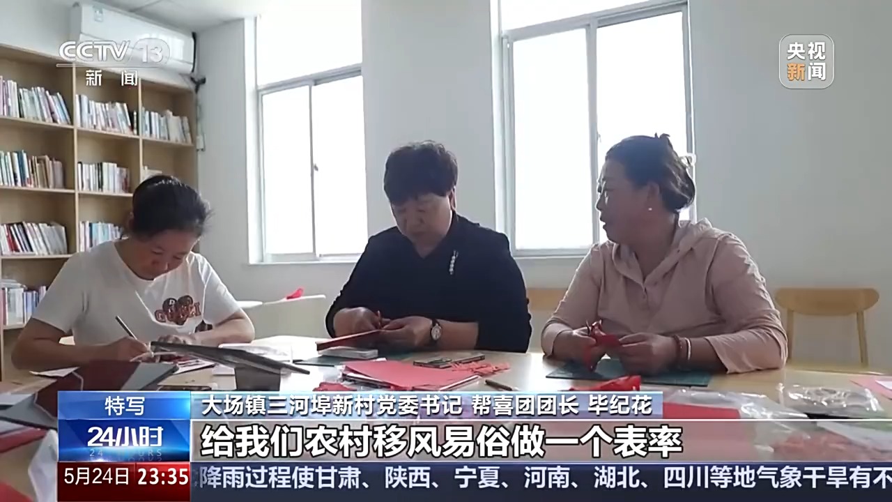 大場鎮(zhèn)三河埠新村黨委書記 幫喜團團長 畢紀花:剛開始的時候我們在一起剪紙,有一位大姐的兒子要結(jié)婚,我們當時就給紀大姐做工作,說她完全可以成為第一個吃螃蟹的人,給我們農(nóng)村移風易俗做一個表率。