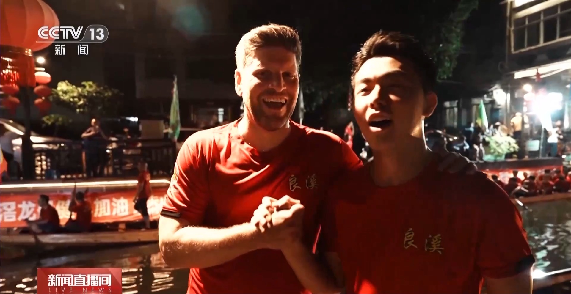 晚上8點,當記者來到佛山南海區(qū)的疊北社區(qū)時,河道兩邊已經圍滿了觀看夜訓的村民和游客。伴隨著鏗鏘鼓點和陣陣歡呼,隊員們揮臂劃槳、破水前行,一艘艘龍舟在河道中穿梭、漂移、折返。在激烈的競技中,一個金發(fā)碧眼的外國面孔正和中國“扒仔”們一起奮力劃行。