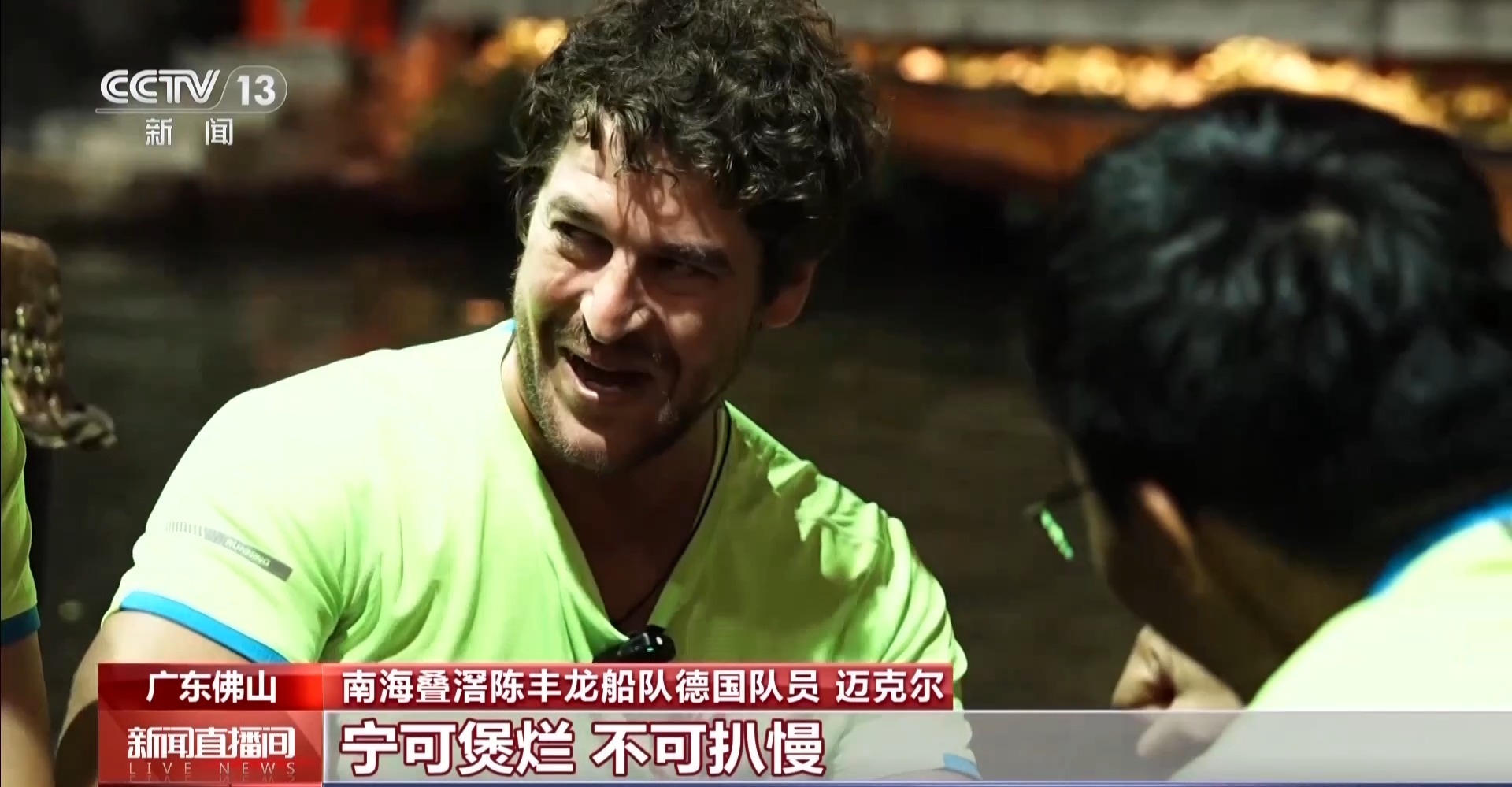 南海疊滘陳豐龍船隊德國隊員 邁克爾:隊員們從一開始就把我當作他們中的一員,給了我很多幫助,讓我很快融入隊伍。有次我落水,身體甚至還沒有露出水面,已經有兩只手把我抓回船上了。我覺得文化是沒有國界的,我們可以一起擁抱生活中美好的事物。
