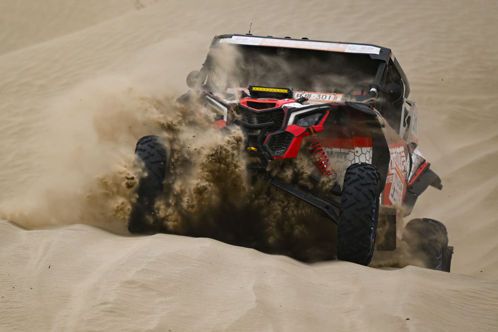 2025年5月31日,極道體育黑熊輪胎車隊(duì)車手趙善鵬、領(lǐng)航員郭峰在比賽中。新華社記者 辛悅衛(wèi) 攝