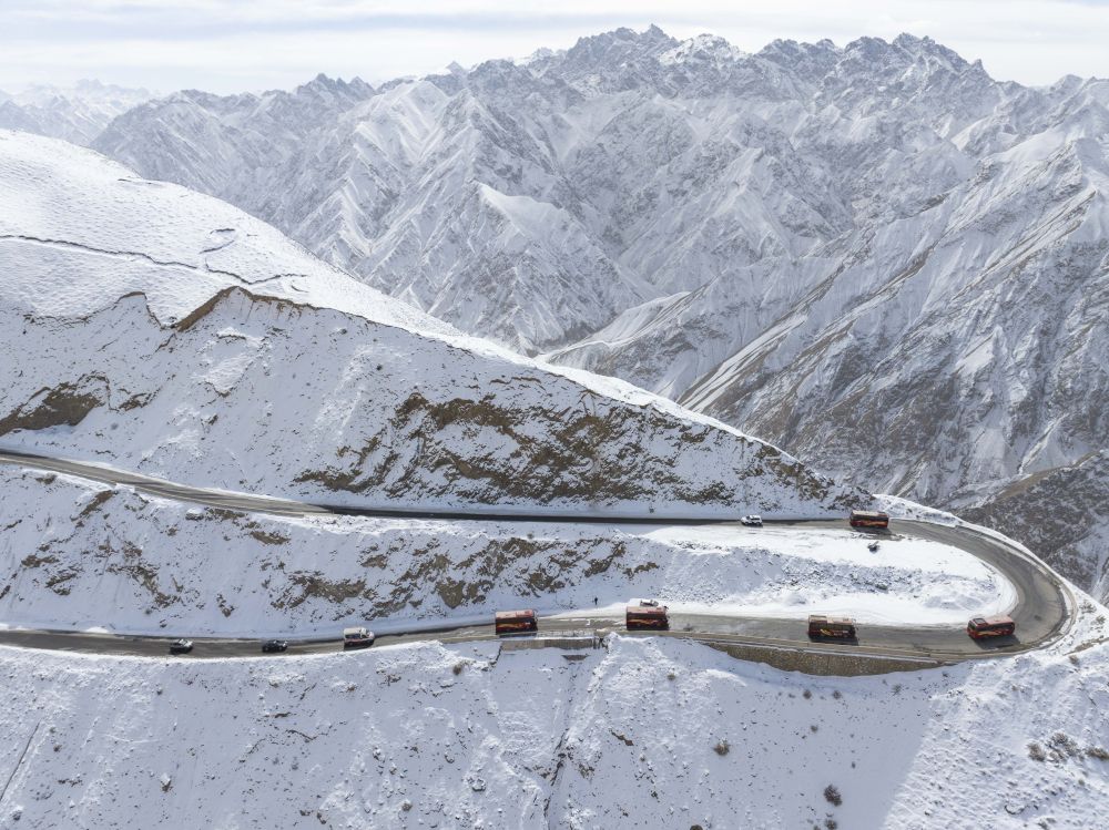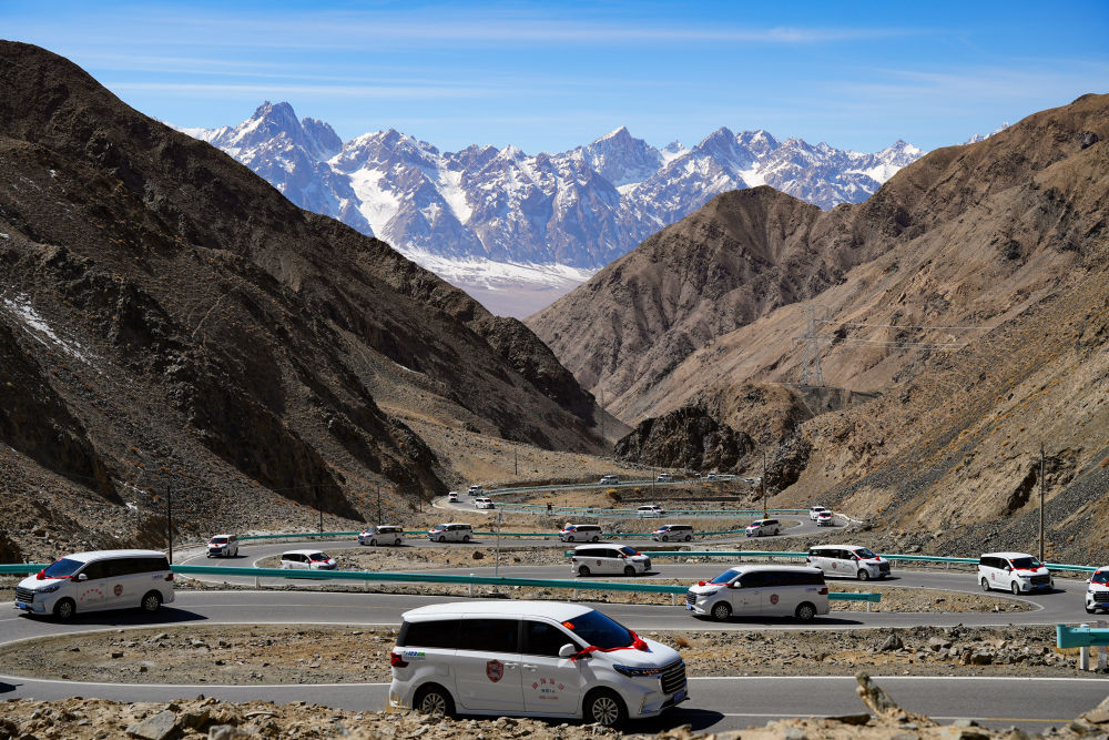在新疆塔什庫爾干塔吉克自治縣,參加“盤龍古道”恢復(fù)通車儀式的車隊(duì)在行進(jìn)中(2025年3月22日攝)。新華社記者 徐宏巖 攝