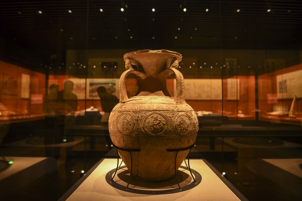 這是在新疆喀什地區(qū)博物館拍攝的國家一級文物“三耳壓花陶罐”(2023年6月12日攝)。新華社記者 胡虎虎 攝