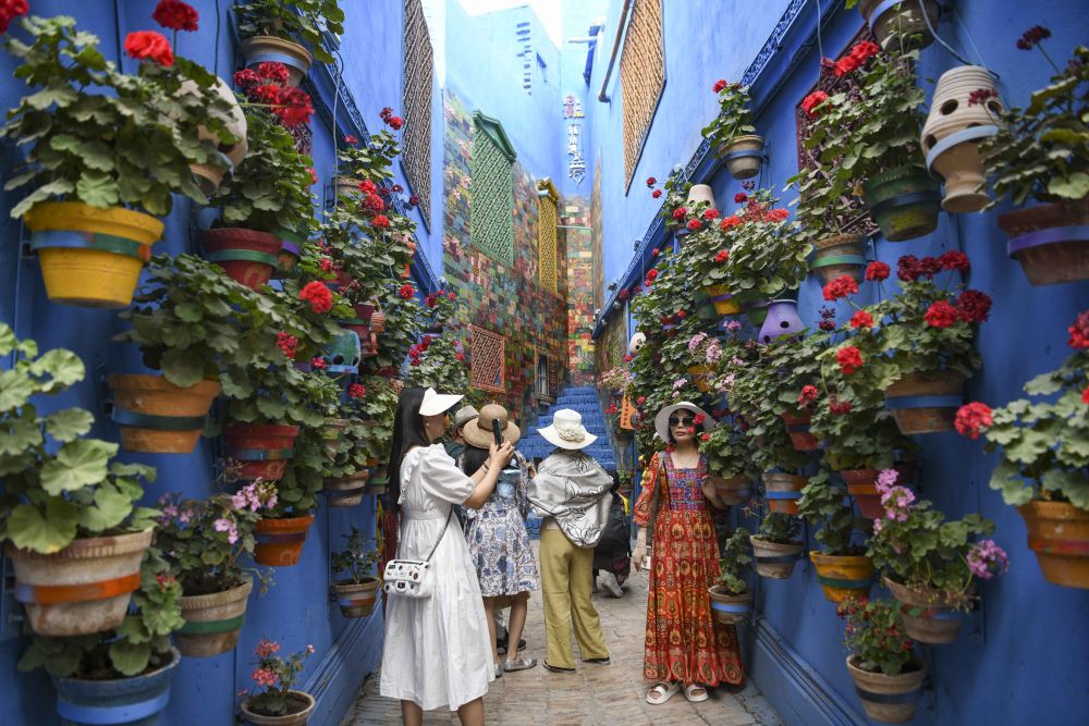 人們在新疆喀什古城景區(qū)彩虹巷內(nèi)游玩拍照(2023年6月14日攝)。新華社記者 胡虎虎 攝