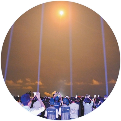 “5,4,3,2,1”——火箭的火焰照亮夜幕,平臺的光束射向天際……19時50分,火箭發(fā)射升空,游客們舉著手機記錄,現(xiàn)場歡呼聲陣陣。“很興奮、很震撼,感覺一伸手就能‘抓’到火箭?!毖逾暦普f。