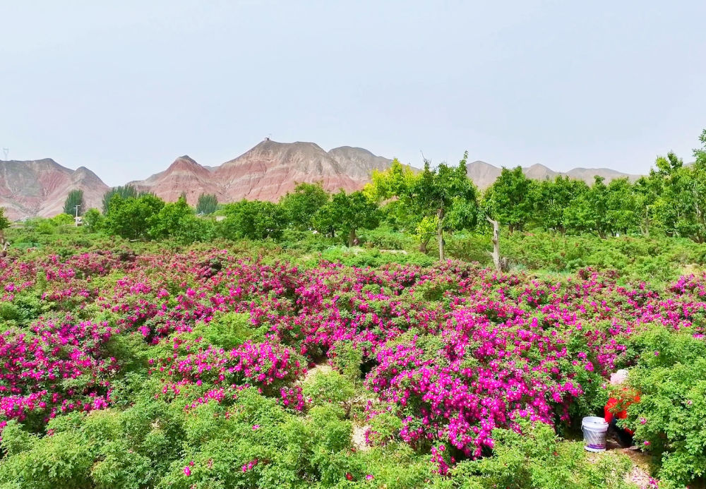 端午前后,大西北的溝梁山峁間,星星點點的綠意,才開始像滴在紙上的玫瑰精油,一片一片串連起來、洇染開來。苦水玫瑰的盛開時節(jié),已經(jīng)到來。姹紫嫣紅的花朵、沁人心脾的花香,醉了這里的每條街巷。