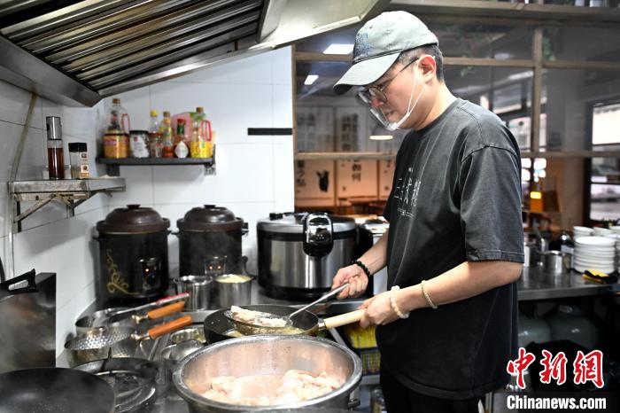 圖為陳駿凱正在店內(nèi)廚房制作菜品。中新網(wǎng)記者 呂明 攝