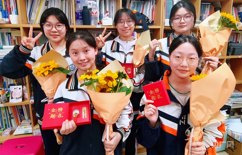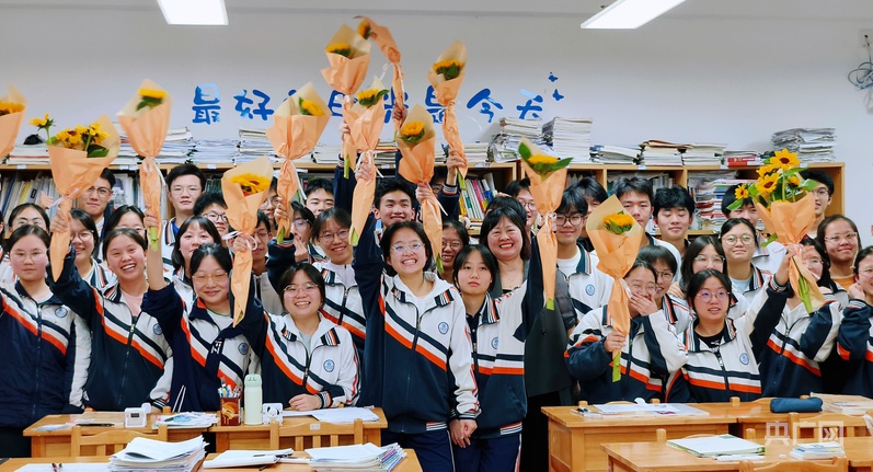 早在幾周前,黎老師就為最后一堂課做足了準(zhǔn)備:三年來(lái)同學(xué)們的照片要制作成短視頻;定制的書簽扣,提醒大家保持閱讀的習(xí)慣、精美的??郏⒁庵松写蟠笮⌒〉目荚?,都能逢考必過(guò);還有學(xué)弟學(xué)妹們親手摘下的向日葵,祝愿學(xué)長(zhǎng)學(xué)姐們一路生花、未來(lái)向陽(yáng)……