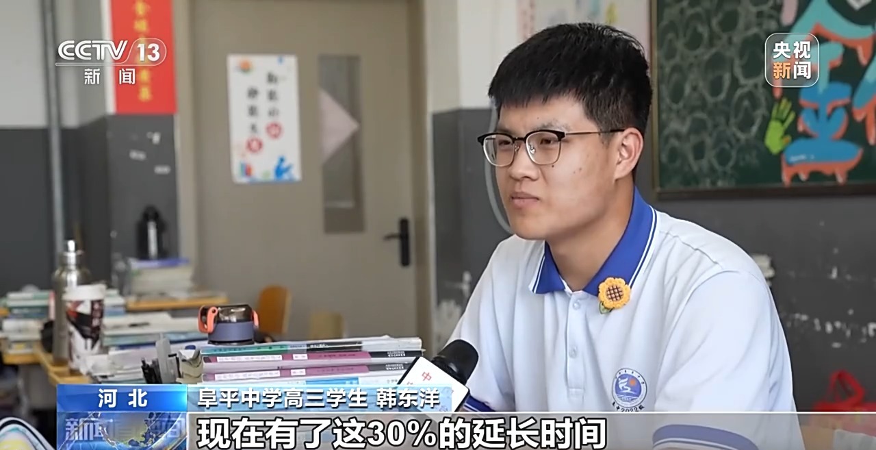 阜平中學高三學生 韓東洋:正常人他們寫300字左右,我大概才能寫200多字,就比如說語文,平常模擬考試的時候,大概還有個二三百或三四百字就寫不完,現在有了這30%的延長時間,心里就比較踏實了。