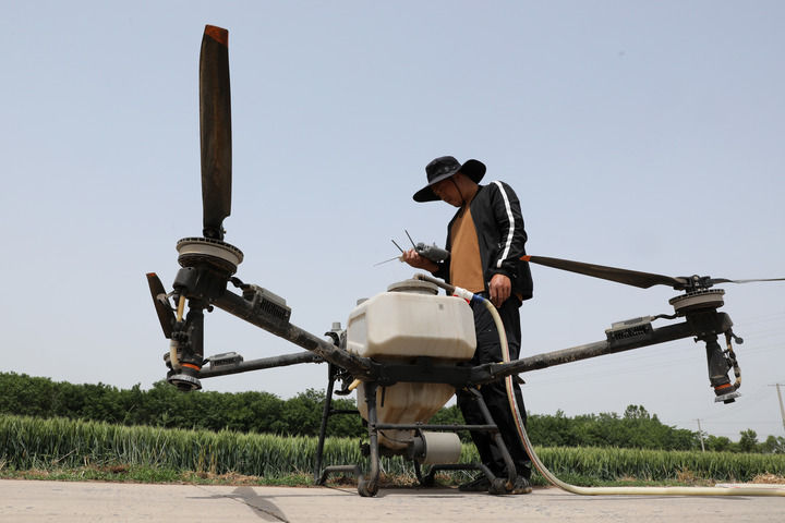 2025年5月7日,在河南省焦作市溫縣祥云鎮(zhèn)古賢村,村民為植保無人機添加藥液開展“一噴三防”。新華社發(fā)(徐宏星攝)