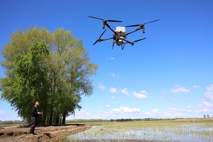 2025年5月21日,在北大荒集團黑龍江綏濱農場有限公司東井管理區(qū),操作員操控搭載北斗導航系統(tǒng)的植保無人機,對即將施返青肥的地塊進行打點。新華社發(fā)(李興攝)