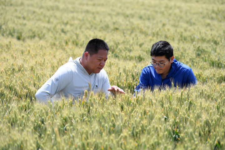 賈俊杰(左)和農業(yè)技術員在山西運城永濟市虞鄉(xiāng)鎮(zhèn)麥田里查看小麥生長情況(2025年5月21日攝)。新華社發(fā)(薛俊攝)