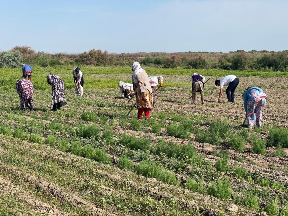6月3日,位于烏茲別克斯坦穆伊納克鎮(zhèn)的咸海國際創(chuàng)新中心的試驗示范園區(qū)內,當地農戶在與中國科學院新疆生態(tài)與地理研究所合作共建的“光伏+生態(tài)”鹽生植物園里勞作。(受訪者供圖)
