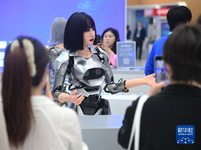 仿生人形機器人在2024中關(guān)村論壇年會會場設置的咨詢臺“迎賓”(2024年4月27日攝)。新華社記者 任超 攝