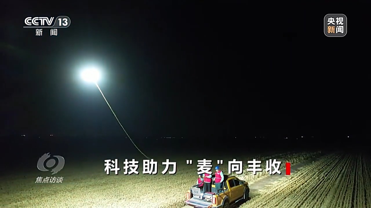像放風(fēng)箏一樣,一個人從供電機牽線,另一個人控制無人機飛行,兩人打好配合,燈隨著車走。經(jīng)過五次磨合試飛,600瓦的燈光終于刺破夜空,照亮了兩畝麥田的區(qū)域。供電所技術(shù)人員的駐守,讓吳從先家的小麥在暴雨來臨前全部入倉。