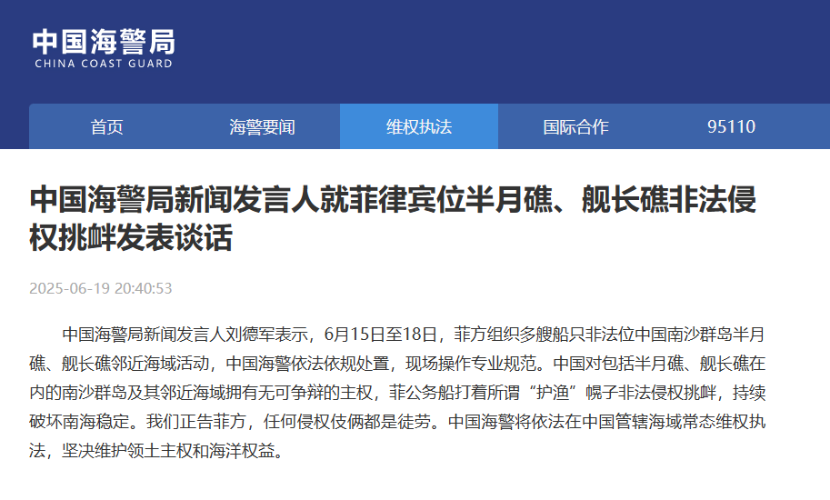 中國海警局新聞發(fā)言人劉德軍表示,6月15日至18日,菲方組織多艘船只非法位中國南沙群島半月礁、艦長礁鄰近海域活動,中國海警依法依規(guī)處置,現(xiàn)場操作專業(yè)規(guī)范。中國對包括半月礁、艦長礁在內(nèi)的南沙群島及其鄰近海域擁有無可爭辯的主權(quán),菲公務(wù)船打著所謂“護漁”幌子非法侵權(quán)挑釁,持續(xù)破壞南海穩(wěn)定。我們正告菲方,任何侵權(quán)伎倆都是徒勞。中國海警將依法在中國管轄海域常態(tài)維權(quán)執(zhí)法,堅決維護領(lǐng)土主權(quán)和海洋權(quán)益。