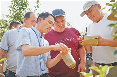 近日,2025年首期中國(guó)—中亞五國(guó)職業(yè)農(nóng)民培訓(xùn)班在陜西渭南開(kāi)班。圖為學(xué)員們?cè)谖鞅鞭r(nóng)林科技大學(xué)蘋果試驗(yàn)站了解蘋果套袋知識(shí)。