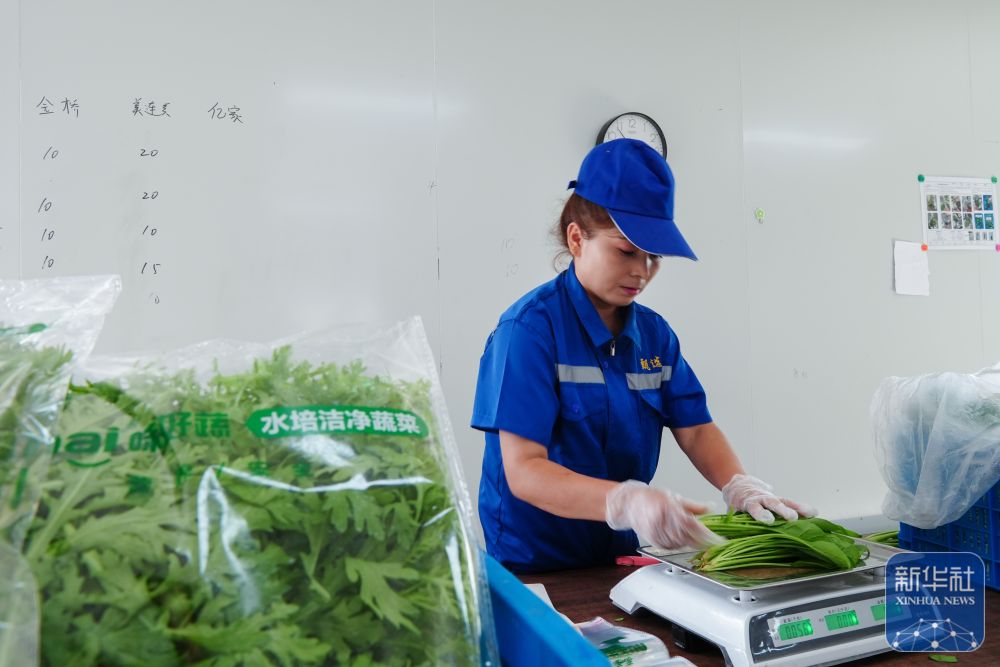 ↑ 6月25日,在新疆阿克蘇地區(qū)庫(kù)車(chē)市甬庫(kù)同心村智慧農(nóng)業(yè)植物工廠,工作人員對(duì)收獲的農(nóng)作物進(jìn)行稱(chēng)重打包。