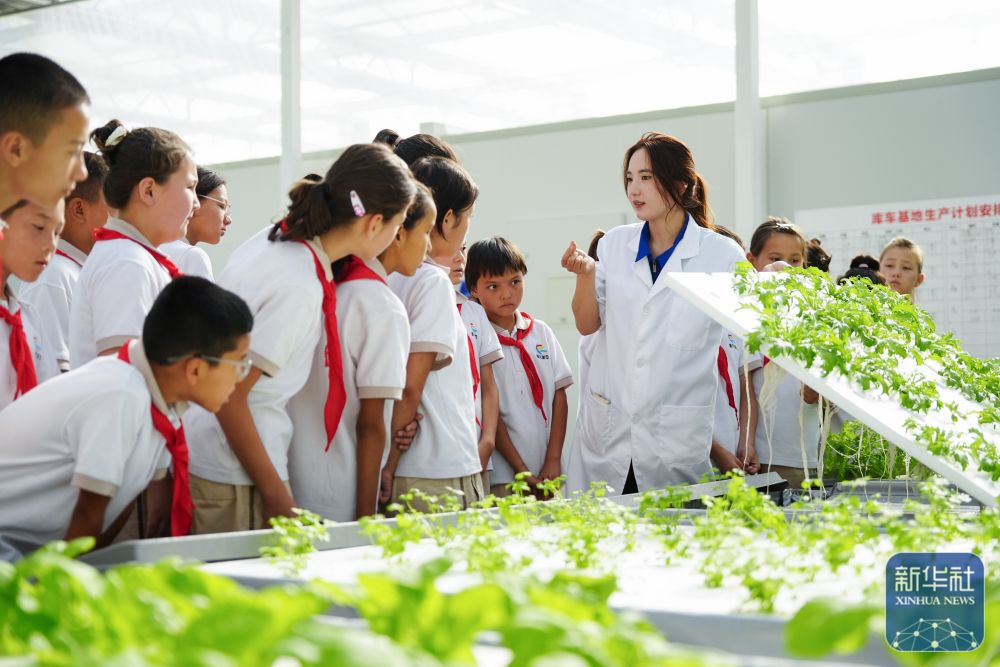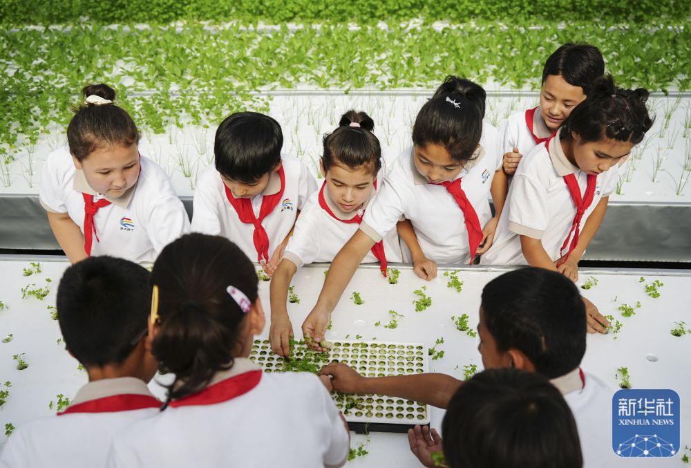 ↑ 6月25日,在新疆阿克蘇地區(qū)庫(kù)車(chē)市甬庫(kù)同心村智慧農(nóng)業(yè)植物工廠,當(dāng)?shù)匦W(xué)生體驗(yàn)無(wú)土栽培。