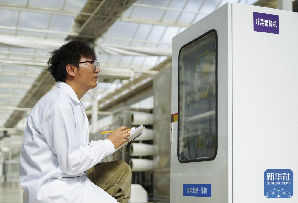 ↑ 6月25日,在新疆阿克蘇地區(qū)庫(kù)車(chē)市甬庫(kù)同心村智慧農(nóng)業(yè)植物工廠,工作人員在監(jiān)測(cè)記錄智能水肥一體機(jī)運(yùn)行情況。