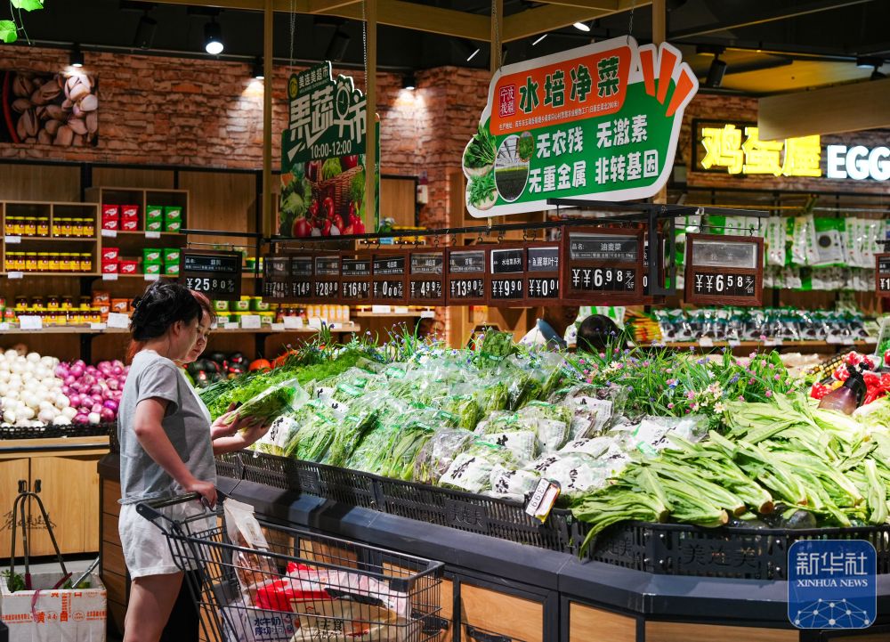 ↑ 6月25日,在新疆阿克蘇地區(qū)庫(kù)車(chē)市美連美超市,人們?cè)谶x購(gòu)甬庫(kù)同心村智慧農(nóng)業(yè)植物工廠的農(nóng)產(chǎn)品。