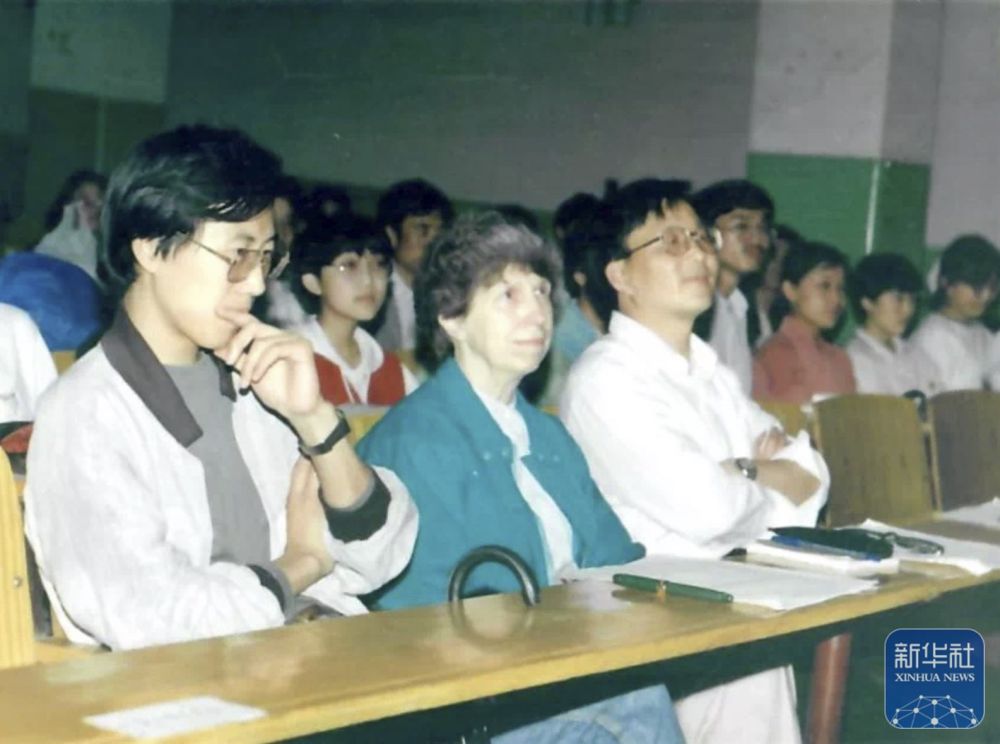 20世紀80年代,白麗詩(前中)在上海外國語大學任教時的工作照(翻拍照片)。