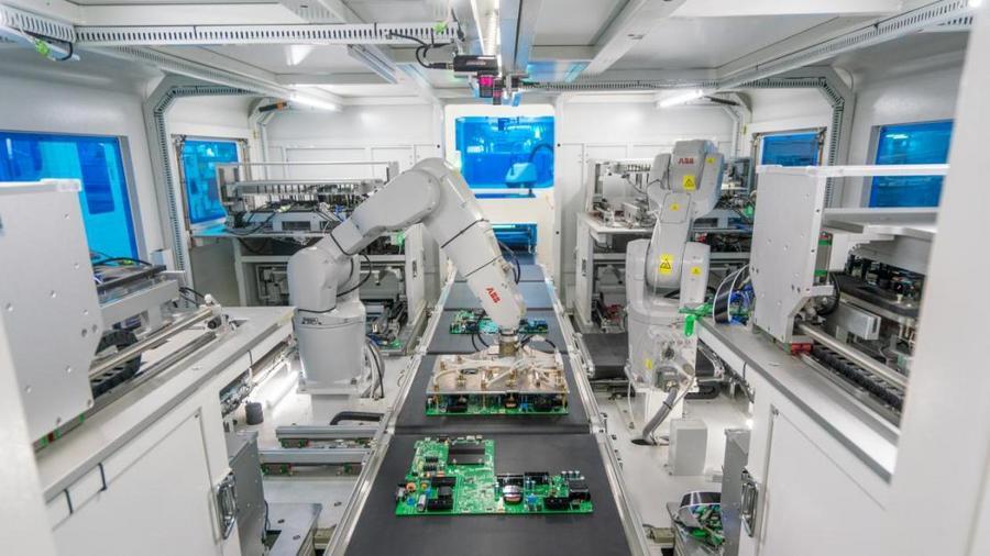 現(xiàn)代化的生產(chǎn)車間里,大部分工作已被機械臂和機器人“接管”;車間一側(cè)的智慧大屏上,實時顯示溫濕度、靜電、隱患巡查等關(guān)鍵數(shù)據(jù)。