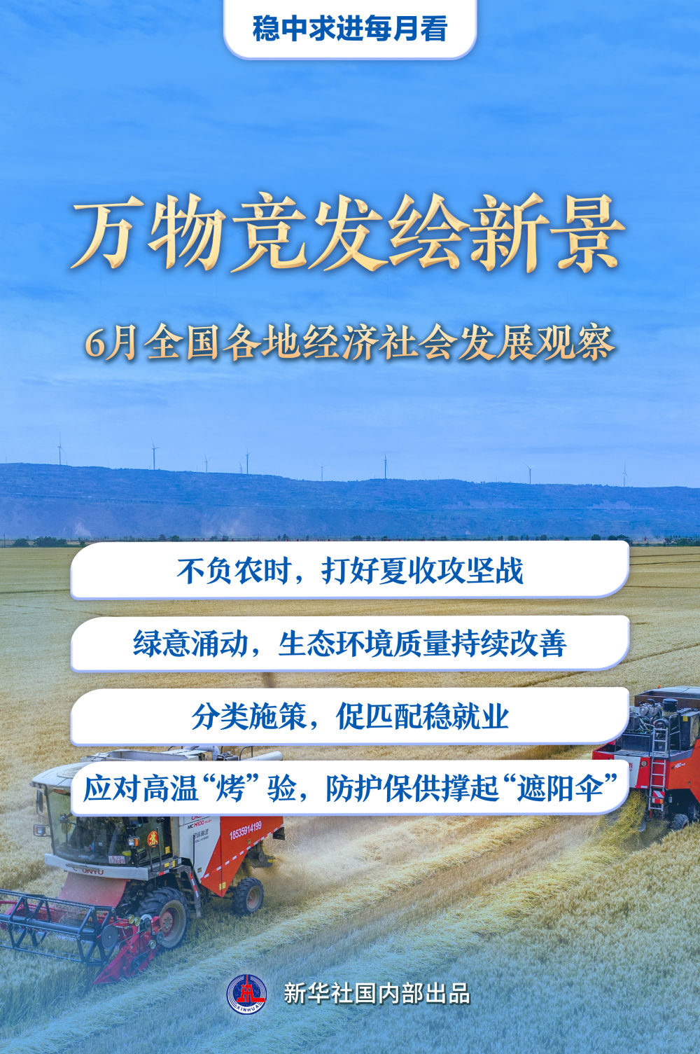 6月仲夏,萬物豐茂。廣袤農(nóng)田上,“三夏”生產(chǎn)進(jìn)入關(guān)鍵階段;綠水青山間,低碳發(fā)展不斷繪就新圖景;全力穩(wěn)就業(yè),政府、企業(yè)與高校同頻共振;高溫“烤”驗下,做好各項保障工作……上半年收官之月,各地各部門統(tǒng)籌推進(jìn)穩(wěn)增長、促改革、惠民生舉措,推動經(jīng)濟(jì)社會沿著高質(zhì)量發(fā)展之路穩(wěn)步前行。