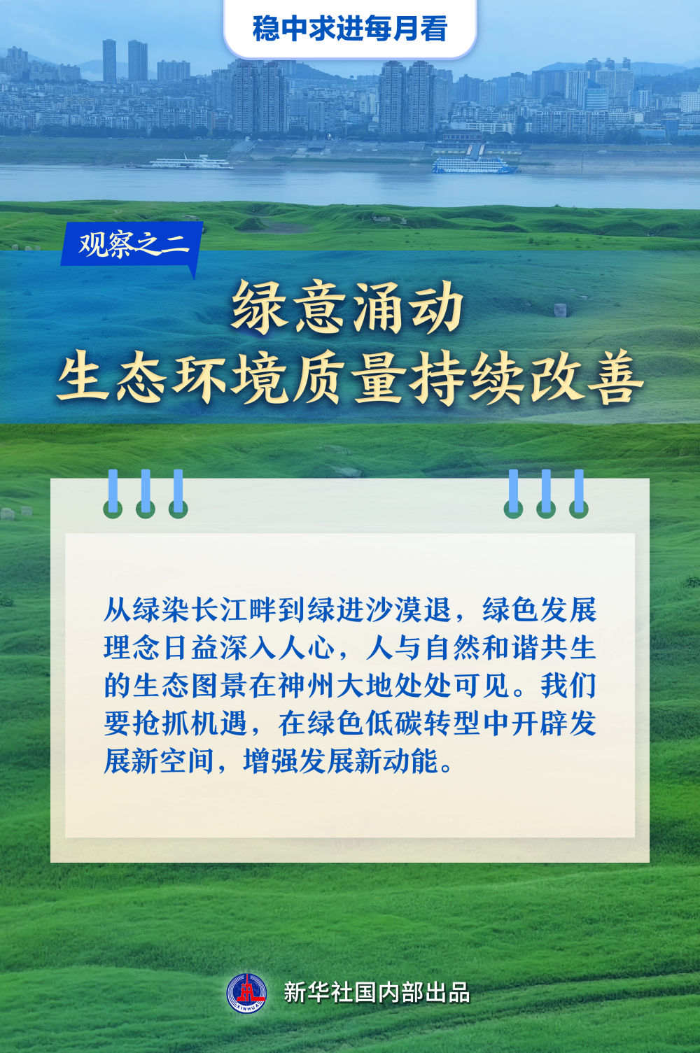 【記者觀察】從綠染長江畔到綠進(jìn)沙漠退,綠色發(fā)展理念日益深入人心,人與自然和諧共生的生態(tài)圖景在神州大地處處可見。我們要搶抓機(jī)遇,在綠色低碳轉(zhuǎn)型中開辟發(fā)展新空間,增強(qiáng)發(fā)展新動能。
