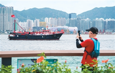 “今日難得天氣涼爽,跟太太一起出來感受下節(jié)日氣氛?!绷窒壬硎?,香港回歸祖國后,在國家支持下越來越好,特別是近幾年社會安定下來,沒有了無休止的爭吵,家人和鄰里關系也親密很多。他相信,只要人心齊,香港一定會更好。