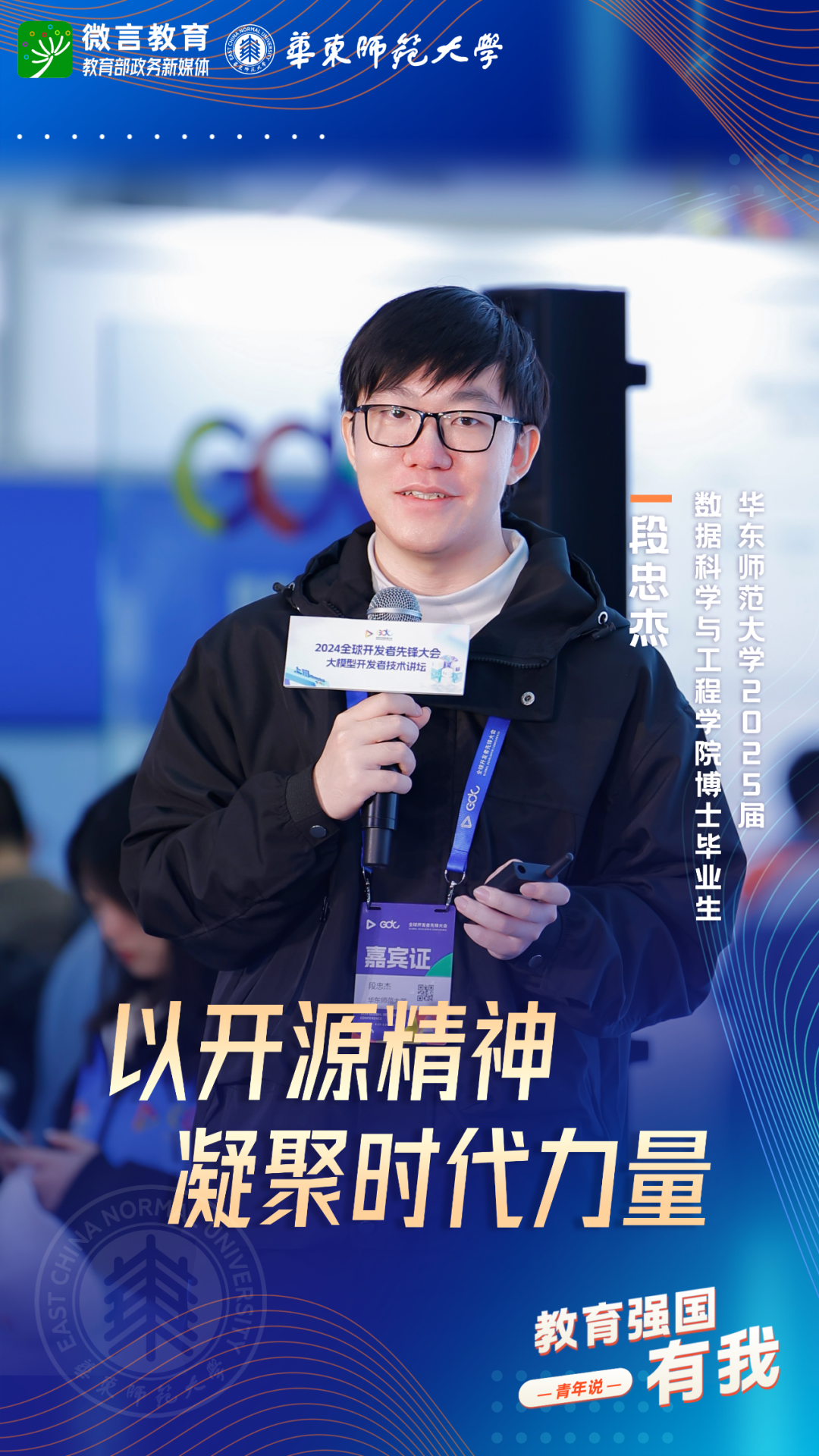 習(xí)近平總書記強(qiáng)調(diào),希望廣大青年堅(jiān)定理想信念,厚植家國(guó)情懷,練就過(guò)硬本領(lǐng),發(fā)揚(yáng)奮斗精神,到祖國(guó)和人民最需要的地方發(fā)光發(fā)熱,為中國(guó)式現(xiàn)代化建設(shè)貢獻(xiàn)青春力量。教育強(qiáng)國(guó)建設(shè),青年何為?教育部政務(wù)新媒體推出“教育強(qiáng)國(guó),有我!”網(wǎng)絡(luò)主題宣傳活動(dòng)之“青年說(shuō)(報(bào)國(guó)篇)”系列,展現(xiàn)青年學(xué)子將個(gè)人理想融入國(guó)家發(fā)展的青春擔(dān)當(dāng)。今天,跟教育小微通過(guò)1個(gè)視頻和1組海報(bào),一起來(lái)看華東師范大學(xué)學(xué)子如何“向新而行”——