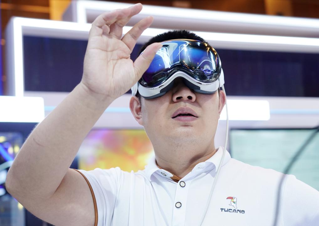 7月2日,參觀者在2025全球數(shù)字經(jīng)濟大會數(shù)字經(jīng)濟國際交流合作體驗區(qū)體驗一款MR混合現(xiàn)實設備。新華社記者 張晨霖 攝