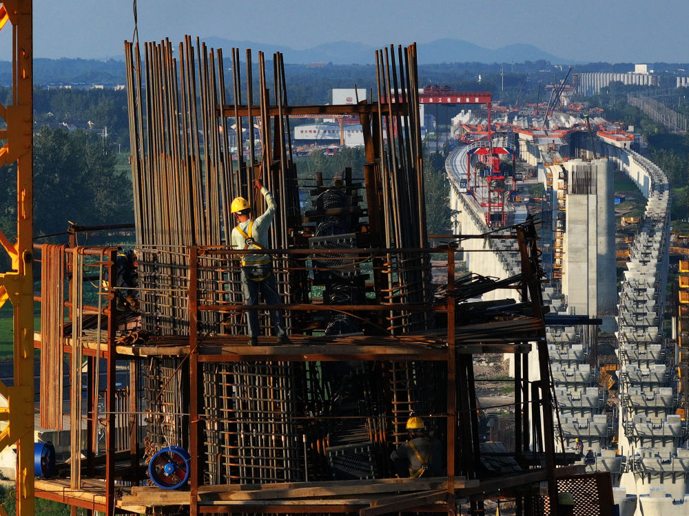7月3日,中鐵上海工程局的工人在寧淮城際鐵路(南京至淮安)5標項目跨滁河斜拉橋施工作業(yè)(無人機照片)。(新華社記者 李博 攝)