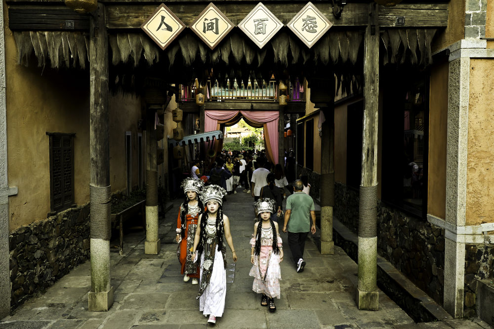夜幕降臨,記者隨“活力中國(guó)調(diào)研行”采訪(fǎng)團(tuán)來(lái)到景區(qū),遠(yuǎn)處懸崖燈火璀璨,如影視劇一般的場(chǎng)景在眼前浮現(xiàn)。游客或沉浸式體驗(yàn)情景劇、舞蹈劇、雜技等演出,或身著古裝拍照打卡,在熱鬧的氛圍里感受“仙俠世界”的浪漫。