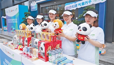 志愿者展示成都世運會文創(chuàng)產品。記者 宋豪新攝