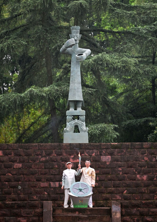2025年7月26日,三星堆博物館代表肖先進(左)、金沙遺址博物館代表朱章義在火種采集儀式上展示火種。當日,第十二屆世界運動會火炬?zhèn)鬟f活動在四川舉行。
