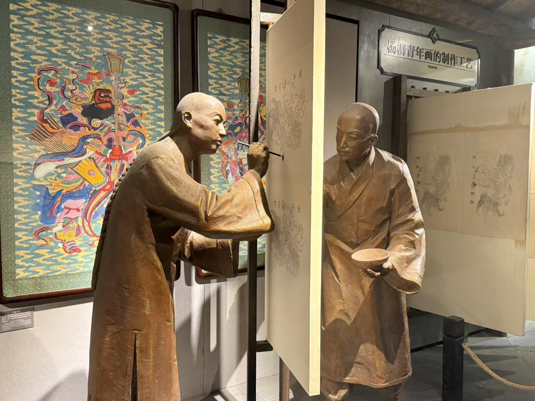 館內(nèi)以楊柳青木版年畫為主線,串聯(lián)起“運河通航--年畫起源柳口”“鄉(xiāng)淀富足--年畫祈福民生”等六大展區(qū)。千余件年畫珍品、民俗老物件、老照片在燈光下靜靜陳列,步入式復原場景里,舊時古鎮(zhèn)的市井喧囂仿佛穿越時空——運河碼頭的商船、年畫作坊的刻版聲、街頭巷尾的叫賣聲,與全息投影、自助語音導覽等現(xiàn)代技術交織,讓“運河帶來商機,商機催生年畫”的歷史脈絡清晰可觸。