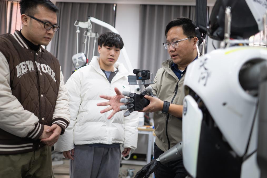 武漢大學(xué)研發(fā)團(tuán)隊在對“天問”人形機器人進(jìn)行調(diào)試。新華社記者肖藝九 攝