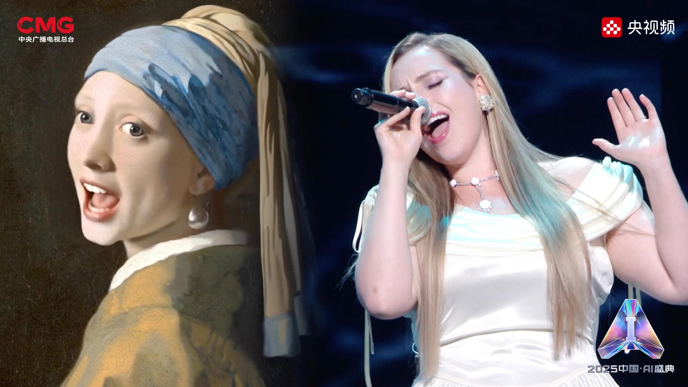 相AI相生,是藝術(shù)想象的無限延展。在AI技術(shù)的賦能下,沉睡的文物重獲新生:圓明園“十二獸首”(復(fù)制品)聚首盛典舞臺,他們化身十二樂師與歌手阿云嘎共同演繹《浮光·十二獸首歸來》,向世界展現(xiàn)東方文化藝術(shù)的魅力;《戴珍珠耳環(huán)的少女》在MiniMax海螺(Hailuo02)視頻模型的驅(qū)動下翩然起舞,與歌手Grace Kinstler隔空對唱《This Is Me》;虛擬偶像“星瞳”與歌手黃齡突破次元壁,浪漫演繹金曲《玫瑰玫瑰我愛你》;根據(jù)歌手張英席、石倚潔、蔡程昱照片生成的數(shù)字人將與“本尊”同臺獻唱,以中、英、意等語言詮釋經(jīng)典歌劇歌曲《今夜無人入眠》;AIGC技術(shù)更讓兵馬俑開啟環(huán)球之旅,在東西方文明的對話中完成文化使者的使命。